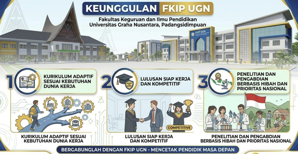 Fakultas Keguruan dan Ilmu Pendidikan Universitas Graha Nusantara merupakan fakultas yang berperan strategis dalam pengembangan ilmu pendidikan dan tenaga kependidikan. FKIP UGN menyelenggarakan pendidikan berbasis kompetensi yang berorientasi pada penguatan kemampuan pedagogik, profesional, dan karakter mahasiswa sebagai calon pendidik. Didukung oleh dosen yang kompeten serta fasilitas pembelajaran yang memadai, FKIP UGN berkomitmen menciptakan lulusan yang unggul, adaptif, dan siap menghadapi tantangan dunia pendidikan di era global.
