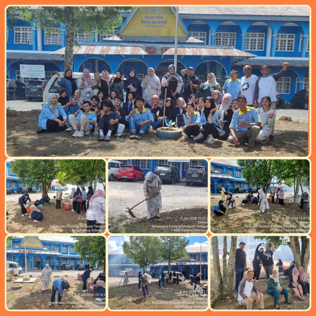 Aksi bersih – bersih Fakultas Ekonomi UGNP dalam rangka Hari Lingkungan Hidup Tahun 2025. Dalam kegiatan aksi bersih – bersih pada Fakultas Ekonomi dihadiri Dekan, Wakil Dekan I, Wakil Dekan II, Kaprodi Manajemen, Kaprodi Ekonomi Pembangunan, Kaprodi Bisnis Digital, seluruh Dosen, Tenaga Kependidikan, BEM-DPM serta Mahasiswa/i Fakultas Ekonomi. Dalam kegiatan aksi bersih – bersih sesuai surat himbauan dari Rektor Universitas Graha Nusantara Nomor : 453/UGN.RKT/LL/2025. Atas nama Pimpinan Universitas Graha Nusantara Padangsidimpuan, saya meng-apresiasi dan mengucapkan terimakasih kepada Dekan Fakultas Ekonomi serta seluruh Dosen, Tendik, Kebersihan, Keamanan, Transfortasi, Mahasiswa/i yang telah melaksanakan kebersihan dilingkungan Fakultas Ekonomi dalam rangka hari Lingkungan hidup tahun 2025. Semoga menjadi amal ibadah buat kita semua, Aamiin…demikian Rektor Dr. Drs. Burhanuddin, M.Pd (Padangsidimpuan, 05 Juni 2025).