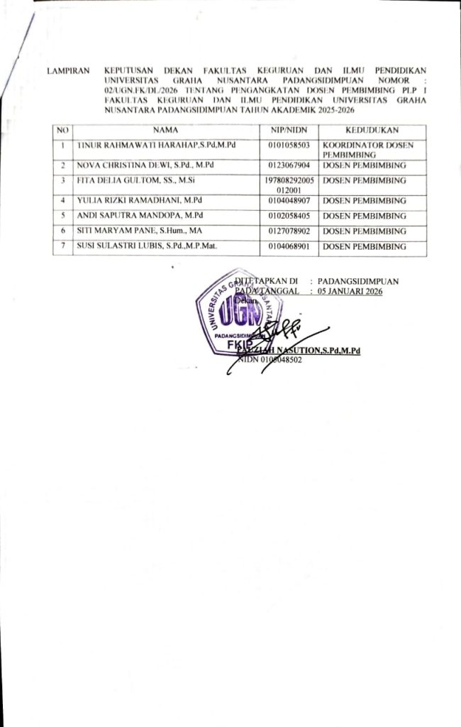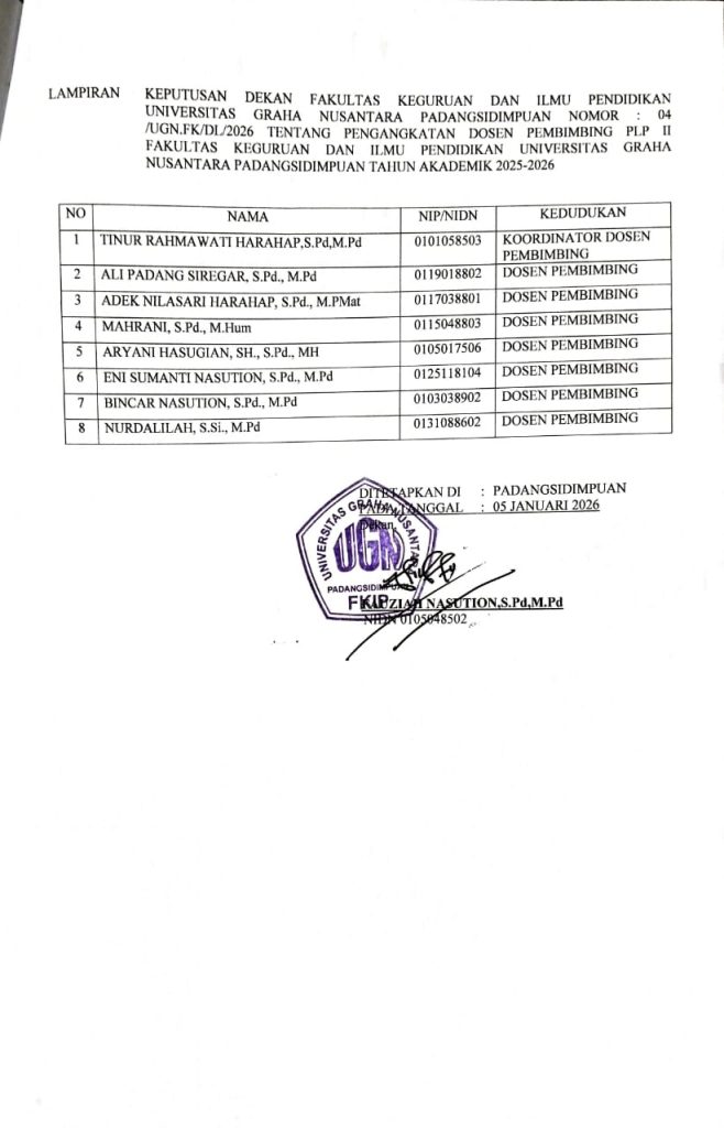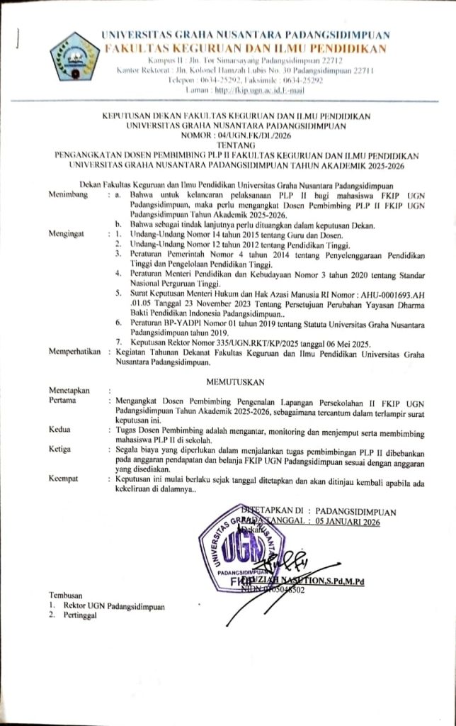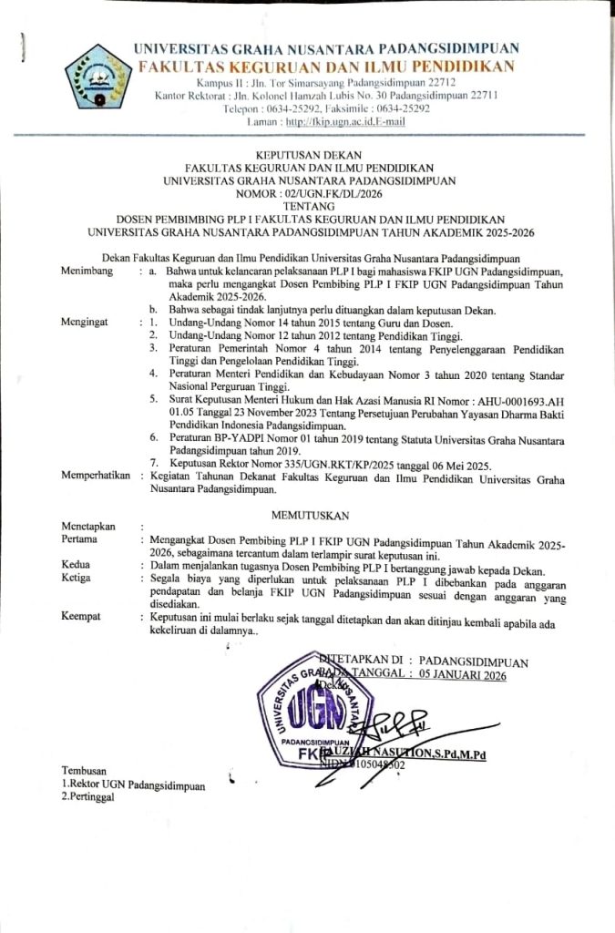Padangsidimpuan – Fakultas Keguruan dan Ilmu Pendidikan (FKIP) Universitas Graha Nusantara (UGN) secara resmi menerbitkan Surat Keputusan (SK) Dosen Pembimbing Lapangan (DPL) untuk kegiatan Pengenalan Lapangan Persekolahan (PLP) 1 dan PLP 2. Penerbitan SK ini bertujuan untuk memastikan kelancaran pelaksanaan tugas mahasiswa di sekolah-sekolah mitra.